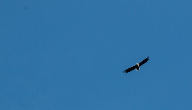 Jeg har tenkt at det kunne være artig å oppleve noe slik en gang. Men å betale 1 000 kroner for det – ja jeg vet ikke helt. Det hender at vi ser havørnene når vi er ute på tur. Jeg har mange uskarpe bilder av en stor rovfugl som kommer svevende. Ganske karakteristisk. God flyver. Men jeg har noen bra bilder også. Det er spennende å vite at man kan treffe på en ørn eller to på en av de mange turene vi har på øya, om det er i fjæresteinene eller litt høyere opp og innover i fjellet.